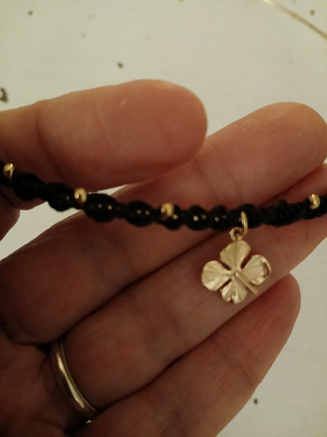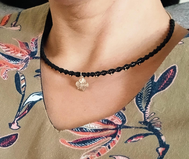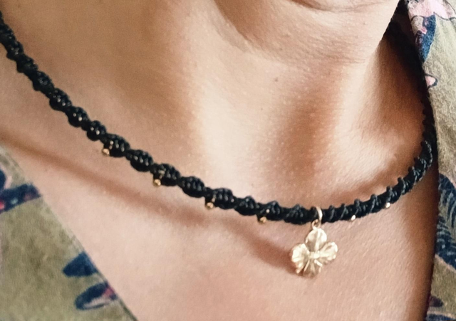 Tressé à la main en micromacramé noir, il s’orne de mini perles en acier inoxydable et d’une breloque plaqué or 3 microns — une qualité qui traverse le temps 💛